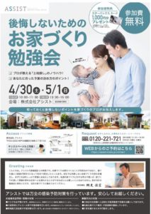 株式会社アシストでは、4月30日、5月1日の10:00~11:30と13:30~15:00に神戸市で新築住宅をお考えの皆様に向けてお家づくり勉強会を開催いたします。