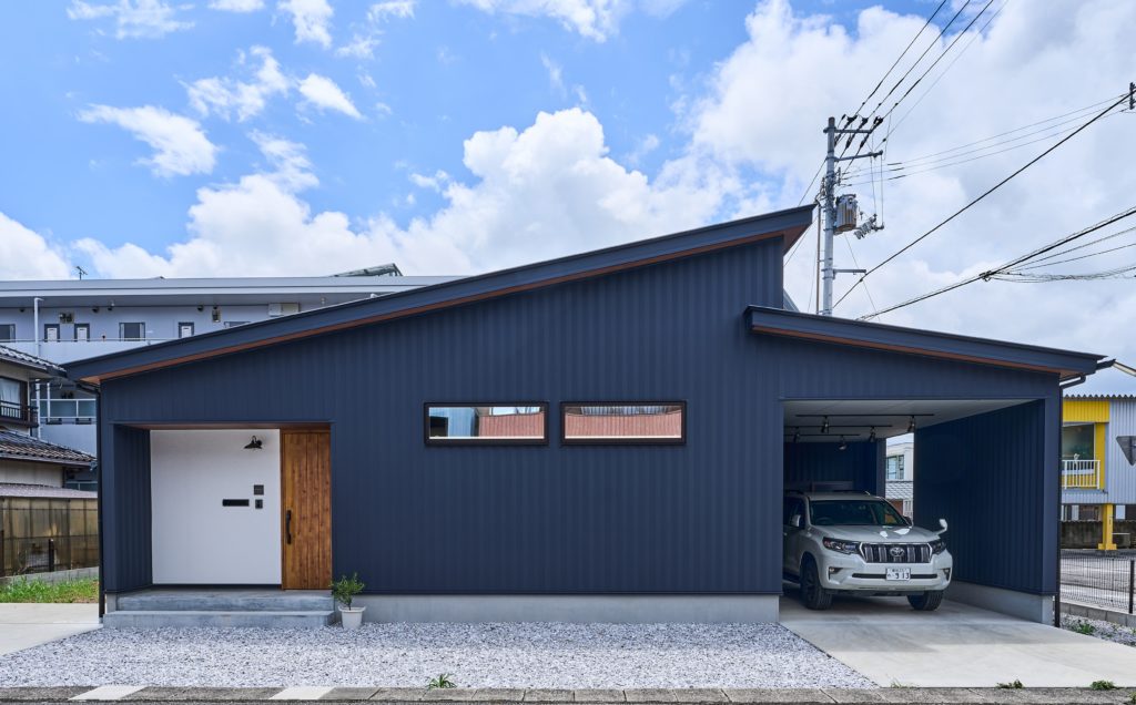 アウトドア好きの夫婦が暮らすインナーガレージのあるかっこいい平屋