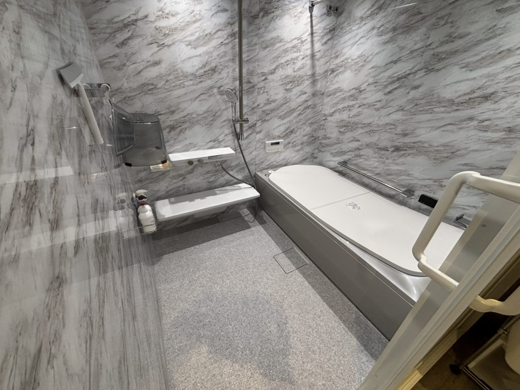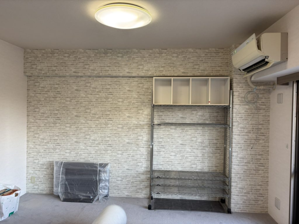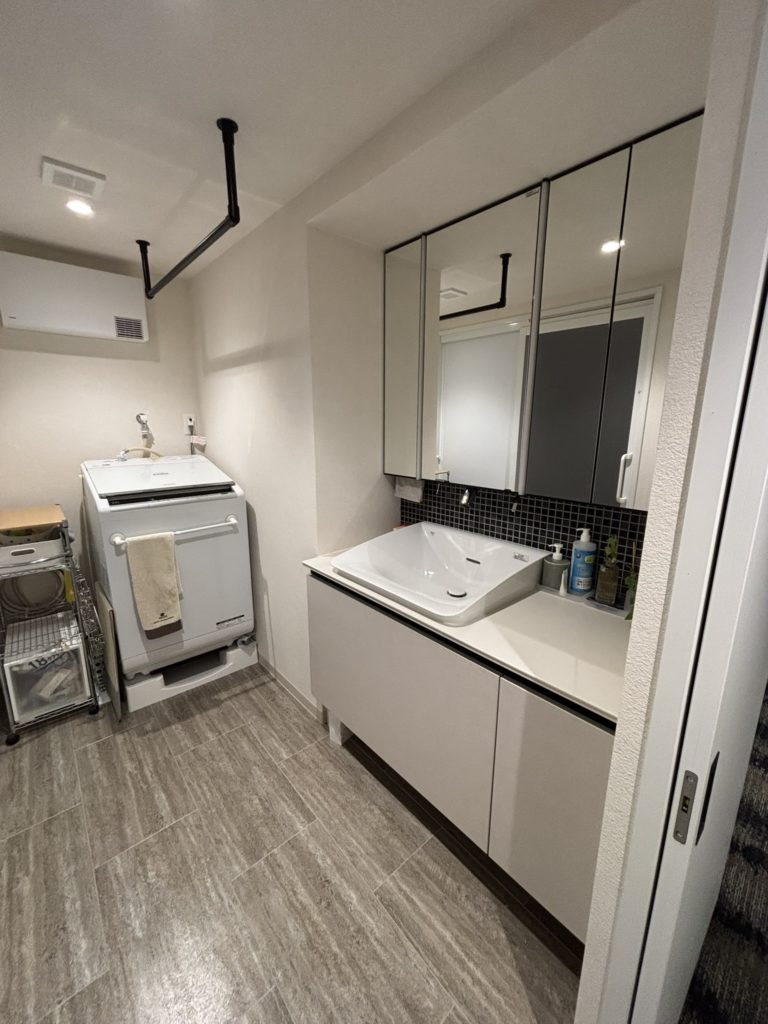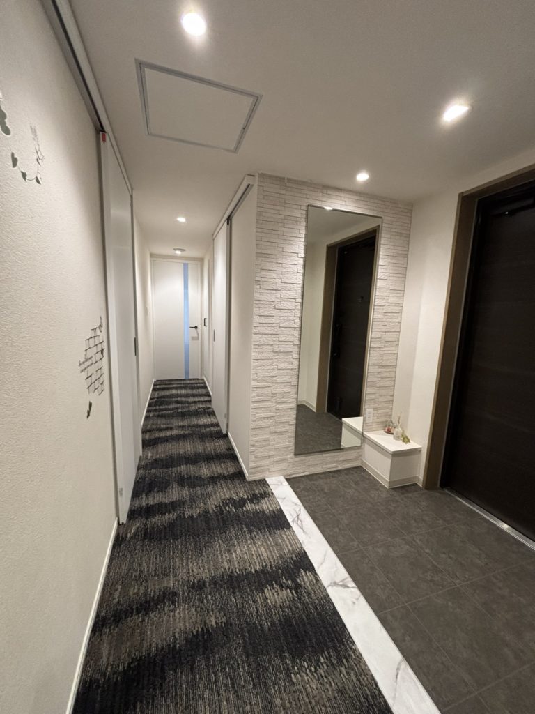 白い石目調の壁に大きなミラーを設置し、空間を広く見せています。ダークトーンのカーペットが加わることで、まるでホテルに帰ってきたような気分に。