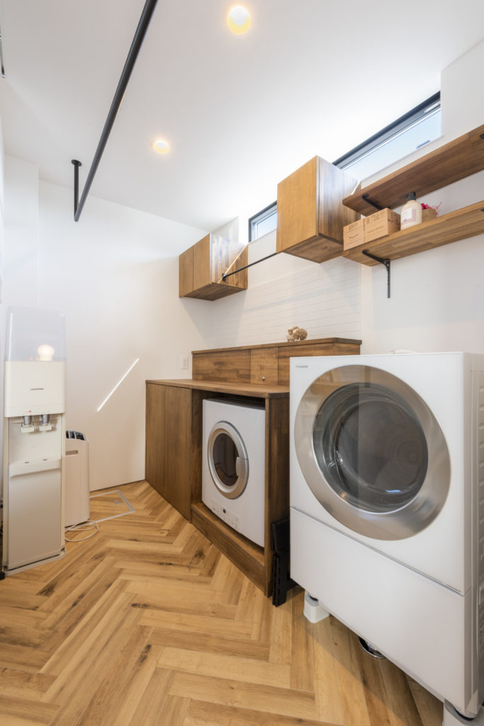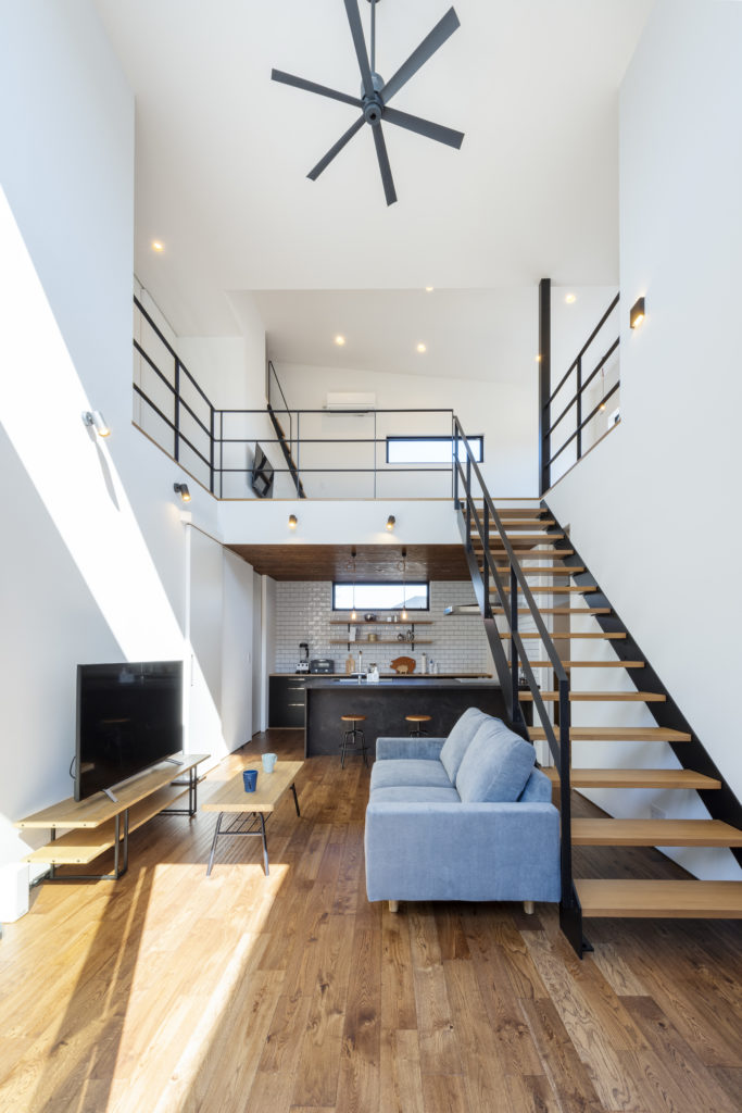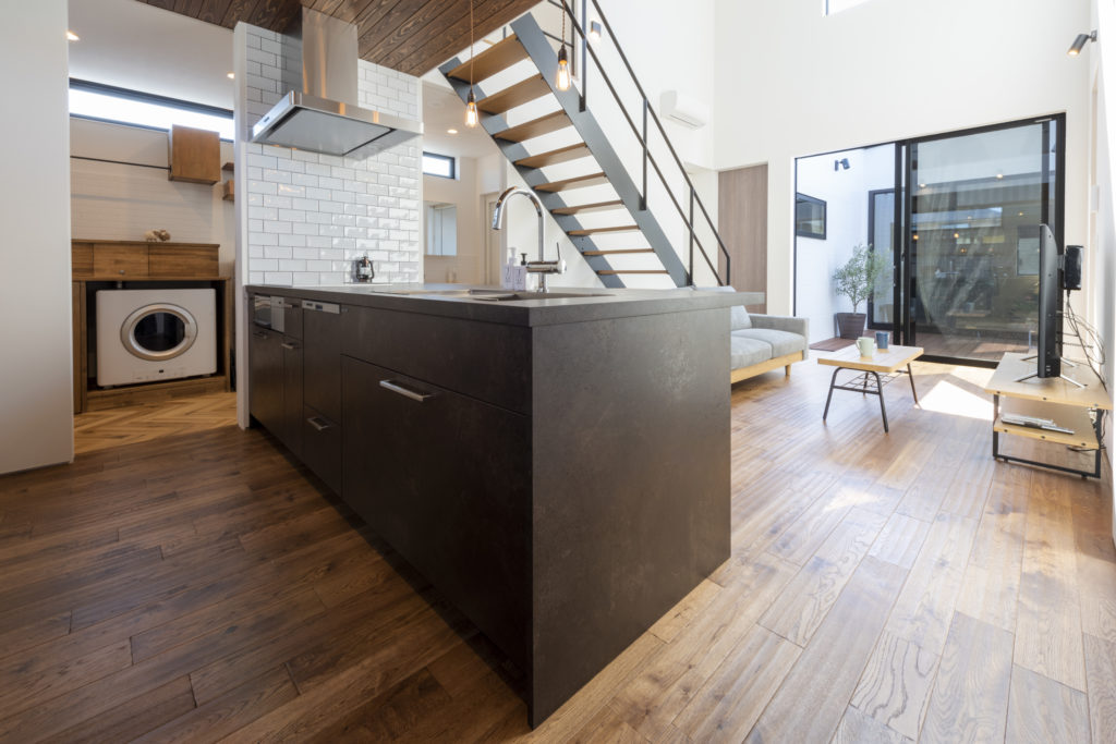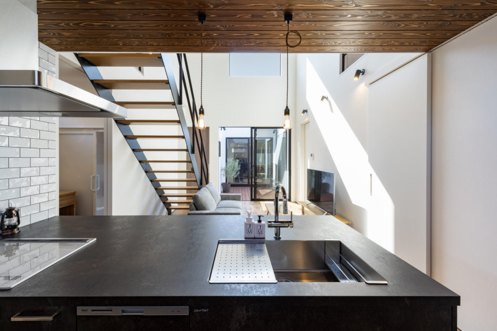 今までにないカッコいい二世帯住宅。キッチンやお風呂は別々ですが、中庭を挟んでお互いのプライバシーは守りつつ呼吸が感じられる、程よい距離感。天井が板貼りの開放感あふれるLDK。キャットステップや造作家具などご家族のこだわりが詰まったお家です。