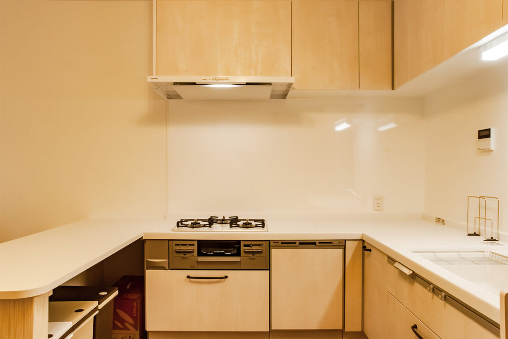 昔ながらの壁付けキッチンは、L字型へと配置を変更し、さらに造作カウンターを設けることで、コの字型のように使える機能的なキッチンに生まれ変わりました。