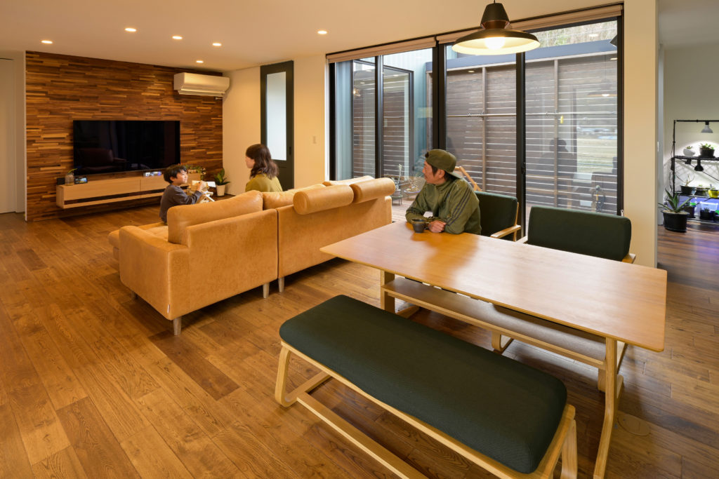 新築 大自然を感じながら、のんびり暮らせるガレージのある平屋 I様邸 ウォークインクローゼットウッドデッキ無垢材 モスグリーンの壁や斜め張りの杉板が調和する素敵な家が完成しました。 ウッドタイルの壁や、スクラッチ加工が施された無垢の床材の風合いを楽しめるリビングは、中庭から明るい光が差し込む開放的な空間。 パントリーを設けたキッチンからは、洗面脱衣室、ウォークインクローゼットなどまでぐるりと一周でき、家事動線も文句なし。 物件概要 延床面積38.16坪(126.15㎡) 前へ 施工事例一覧 次へ